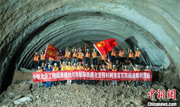 自貢至宜賓高鐵控制性工程、全線(xiàn)唯一高瓦斯隧道杉樹(shù)灣隧道貫通現場(chǎng)?!⒅铱?攝