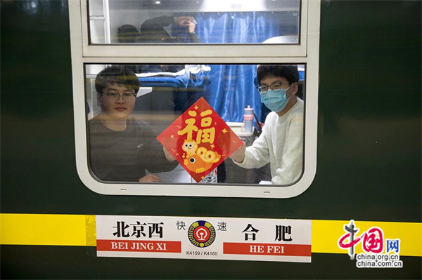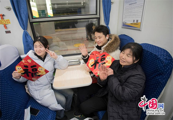旅客在K4159次列車(chē)上展示福字。中國網(wǎng)記者 馬曠/攝