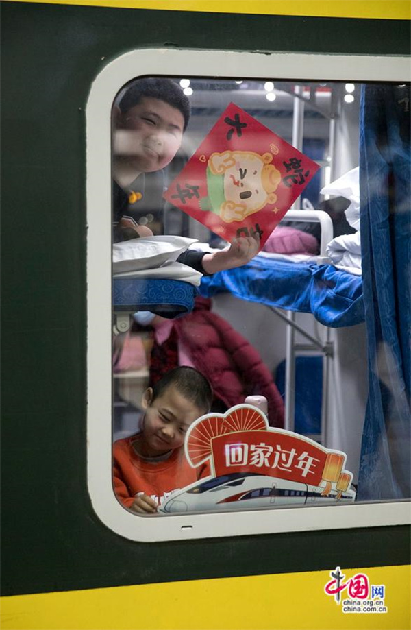 小朋友在車(chē)廂窗口期盼年味兒到來(lái)。中國網(wǎng)記者 馬曠/攝